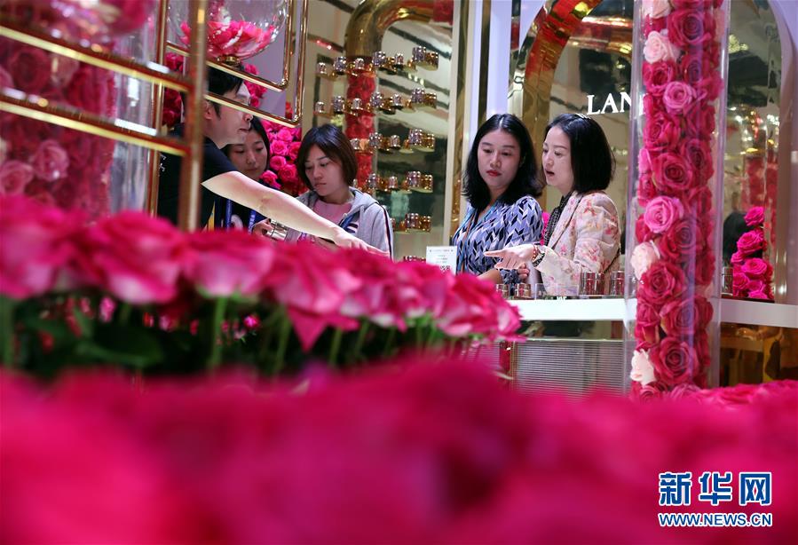 參觀者在第二屆進博會品質生活展區一家化妝品展臺參觀(2019年11月6日攝)。