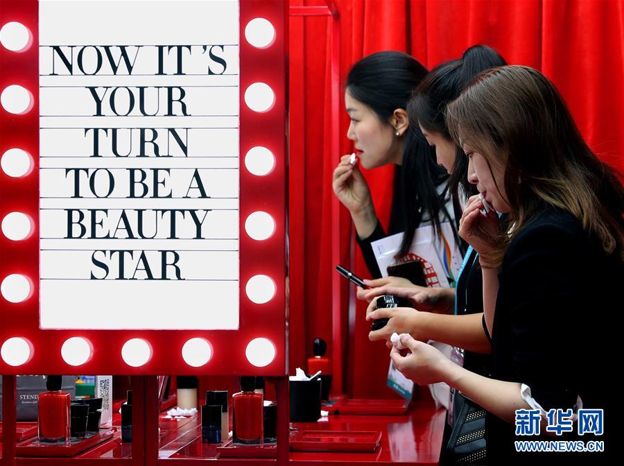 在第二屆進博會品質生活展區,觀眾在歐萊雅旗下品牌彩妝展臺試用口紅(2019年11月6日攝)。