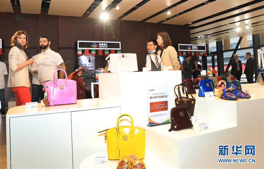 2020年5月8日,虹橋品匯國別文化節云游意大利主題展在上海虹橋進口商品展示交易中心舉行,參觀者從展覽上一個意大利皮具展示臺前走過。