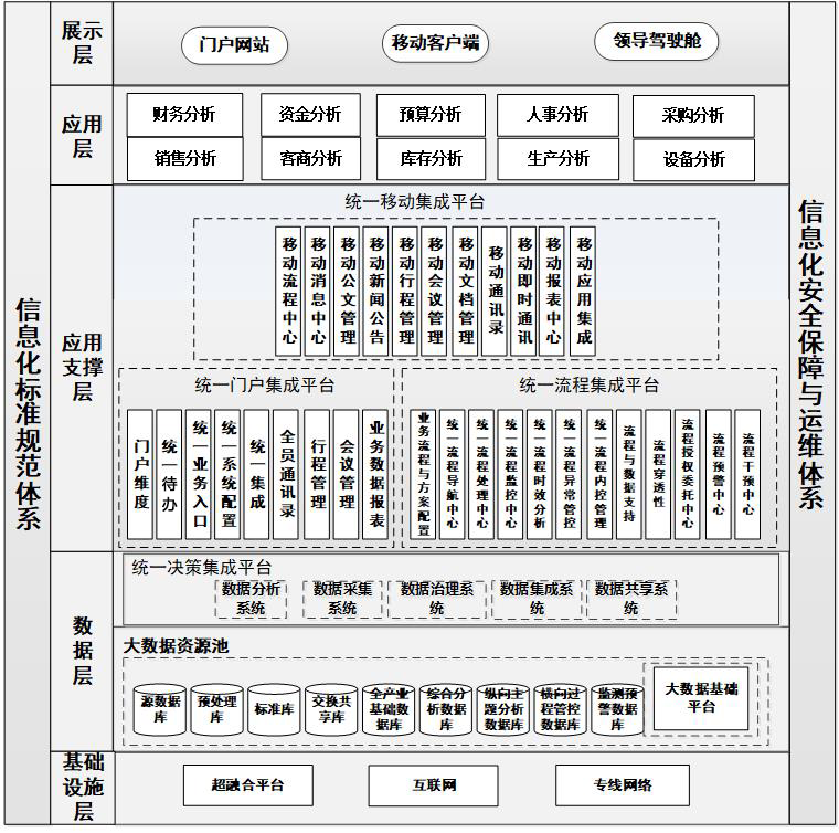一是搭系統,整體推進業務應用階段。謀(mou)劃(hua)制(zhi)定信(xin)息(xi)化(hua)整體戰略,大(da)(da)力推進兩化(hua)深度(du)融(rong)合,以信(xin)息(xi)化(hua)改造傳統業(ye)務。按照(zhao)“統一規(gui)劃(hua),分步(bu)實(shi)施”原(yuan)則,圍繞集團核(he)心業(ye)務,以提升管(guan)理(li)(li)(li)精細化(hua)、專業(ye)化(hua)水平為目標(biao),打破信(xin)息(xi)孤島,整合內部(bu)資源,建設涵蓋(gai)OA,財務核(he)算、資金管(guan)理(li)(li)(li)、資產管(guan)理(li)(li)(li)、HR管(guan)理(li)(li)(li)、供應(ying)鏈管(guan)理(li)(li)(li)、生產指揮和控制(zhi)、技改技措管(guan)理(li)(li)(li)等20多(duo)個業(ye)務系統,實(shi)現數據的大(da)(da)集中、信(xin)息(xi)的大(da)(da)貫通。