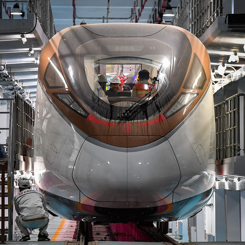 參加熱滑試驗的技術人員對廣州地鐵18號線時速160公里電客車進行發車前最后一次設備狀況查驗(3月3日攝)。