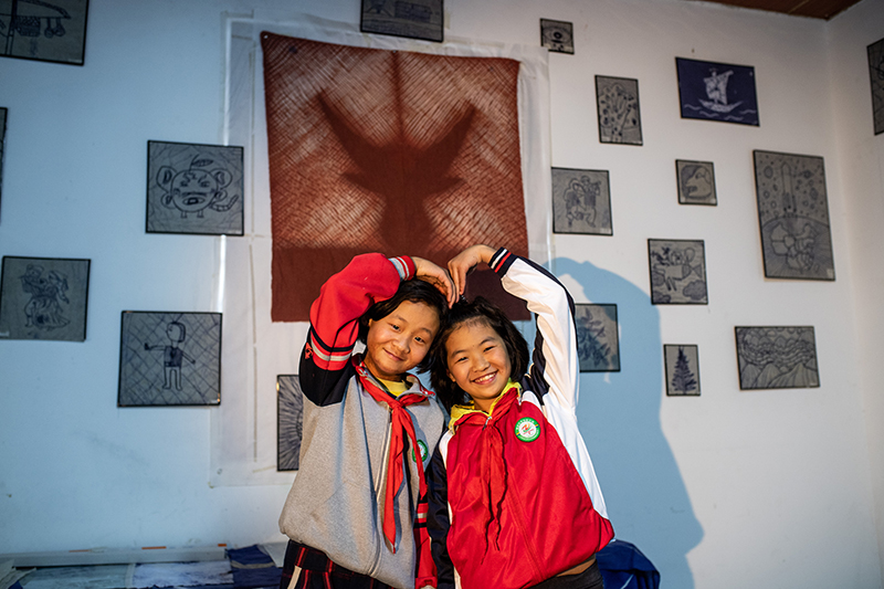 在云南貢山獨龍族怒族自治縣獨龍江鄉九年一貫制學校,獨龍族學生普艷芳(左)和魯艷美面對鏡頭擺出“心”形(2020年10月28日攝)。