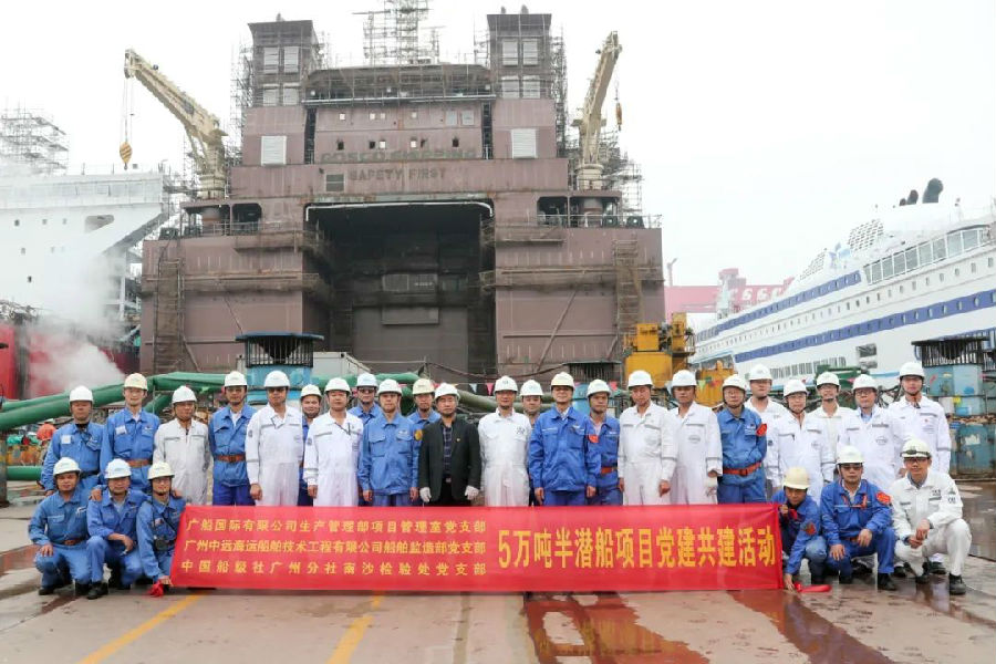 2021年(nian)3月5日,中(zhong)國(guo)船(chuan)(chuan)舶集團(tuan)廣(guang)(guang)船(chuan)(chuan)國(guo)際有(you)限公(gong)司生產管理(li)部(bu)項目管理(li)室黨(dang)(dang)支(zhi)部(bu)、廣(guang)(guang)州(zhou)中(zhong)遠海(hai)運船(chuan)(chuan)舶技術(shu)工程有(you)限公(gong)司船(chuan)(chuan)舶監造部(bu)黨(dang)(dang)支(zhi)部(bu)和中(zhong)國(guo)船(chuan)(chuan)級社(she)(CCS)廣(guang)(guang)州(zhou)分(fen)社(she)南沙檢驗(yan)處黨(dang)(dang)支(zhi)部(bu)三方在正在建(jian)造的(de)5萬(wan)噸半潛船(chuan)(chuan)上舉行(xing)“當(dang)好標桿(gan)旗幟(zhi),確(que)保按(an)期交船(chuan)(chuan)”黨(dang)(dang)建(jian)共建(jian)活(huo)動,以促進該船(chuan)(chuan)按(an)期交付(fu)。