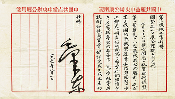 1954q??日,毛泽东主席向国营z都机械厂亲W签|嘉勉信