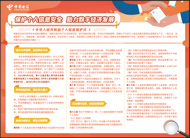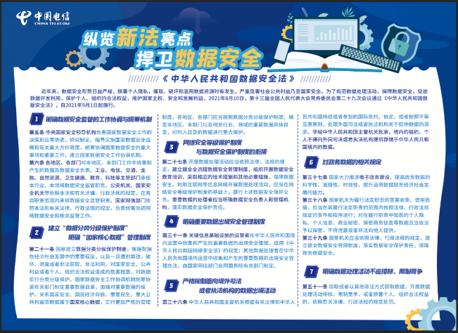 為深入學(xue)習(xi)(xi)宣(xuan)傳(chuan)和(he)貫(guan)徹(che)落(luo)實(shi)(shi)(shi)《數據(ju)安(an)全(quan)(quan)法(fa)》《個(ge)(ge)(ge)人信息保(bao)(bao)(bao)護(hu)(hu)法(fa)》,中國(guo)電信在(zai)全(quan)(quan)集團開展(zhan)(zhan)體系(xi)(xi)化學(xue)習(xi)(xi)宣(xuan)傳(chuan),并(bing)結合(he)企業實(shi)(shi)(shi)際,采取切(qie)實(shi)(shi)(shi)措施貫(guan)徹(che)落(luo)實(shi)(shi)(shi)。及時印發《關(guan)于開展(zhan)(zhan)<數據(ju)安(an)全(quan)(quan)法(fa)><個(ge)(ge)(ge)人信息保(bao)(bao)(bao)護(hu)(hu)法(fa)>學(xue)習(xi)(xi)宣(xuan)貫(guan)工(gong)作的通知(zhi)》,在(zai)中國(guo)電信網上大學(xue)“天(tian)翼(yi)法(fa)苑”普法(fa)專區上線13個(ge)(ge)(ge)系(xi)(xi)列課程。對照《數據(ju)安(an)全(quan)(quan)法(fa)》《個(ge)(ge)(ge)人信息保(bao)(bao)(bao)護(hu)(hu)法(fa)》規(gui)定,制(zhi)訂(ding)合(he)規(gui)義務清(qing)單,梳理86項具體落(luo)實(shi)(shi)(shi)工(gong)作并(bing)細化相應舉措和(he)時間(jian)表。開展(zhan)(zhan)涉(she)及《數據(ju)安(an)全(quan)(quan)法(fa)》《個(ge)(ge)(ge)人信息保(bao)(bao)(bao)護(hu)(hu)法(fa)》的50余項規(gui)章制(zhi)度立(li)改(gai)廢(fei)釋(shi)。從(cong)制(zhi)度、規(gui)范(fan)、流程、協議、系(xi)(xi)統等五個(ge)(ge)(ge)方面,查找問題(ti)隱患,切(qie)實(shi)(shi)(shi)防范(fan)法(fa)律風(feng)險,全(quan)(quan)面提升中國(guo)電信網絡安(an)全(quan)(quan)和(he)個(ge)(ge)(ge)人信息保(bao)(bao)(bao)護(hu)(hu)水平。