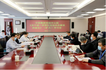 為深入學習貫徹習近平法治思想,全面推進法治中鋁建設,12月7日中鋁集團召開黨組中心組(擴大)學習會,專題學習《關于進一步深化法治央企建設的意見》(以下簡稱《意見》)。集團黨組書記、董事長姚林主持會議并講話,總經理、黨組副書記劉祥民親自領學,對《意見》進行了詳細解讀。集團全體黨組成員,總經理助理、總法律顧問,總部各部門、一院三中心主要負責人參加學習,并進行了深入交流研討。