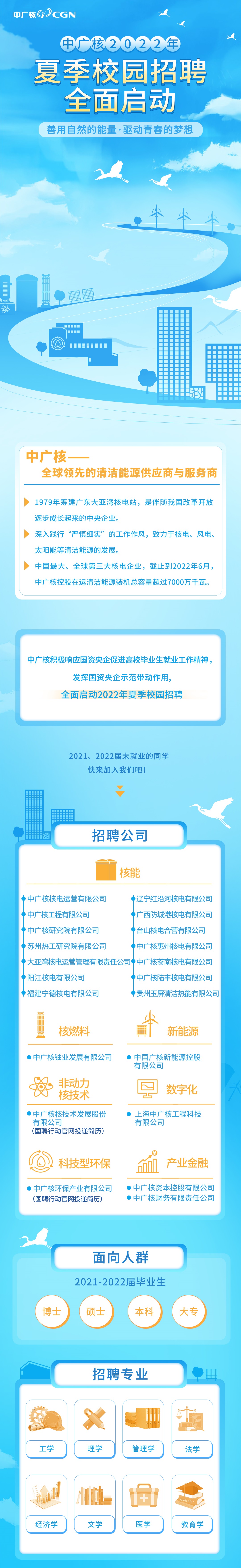 為(wei)深入(ru)貫徹習近平總書記關于做好(hao)高校(xiao)畢業(ye)生(sheng)就業(ye)工作的(de)重要指示(shi)批示(shi)精神,堅決落實(shi)黨中(zhong)央(yang)、國(guo)務院穩就業(ye)保(bao)就業(ye)決策部署(shu),充分發揮國(guo)資央(yang)企促就業(ye)示(shi)范帶動(dong)作用,中(zhong)廣核作為(wei)全球(qiu)領先的(de)清(qing)潔能源供應商與(yu)服務商,積(ji)極踐行央(yang)企擔當,全面啟動(dong)2022年(nian)夏季校(xiao)園招聘,誠(cheng)邀廣大高校(xiao)畢業(ye)生(sheng),為(wei)助力實(shi)現“雙(shuang)碳”目標(biao)貢(gong)獻智慧,一起(qi)點亮綠色未(wei)來!