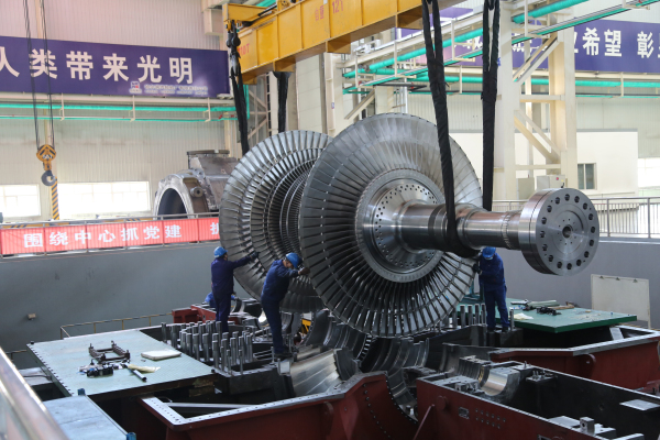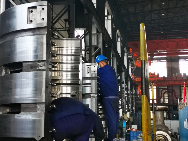 哈電集團汽輪機公司重裝分廠操作者正在裝配國投內蒙古上海廟項目低壓模塊裝配,該項目是重裝分廠機組總裝青年突擊隊開展的沖刺開門紅攻關任務