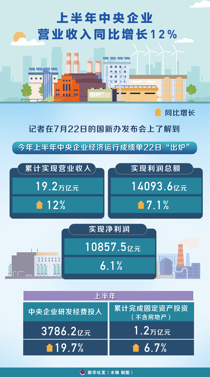 新(xin)華社(she)北京(jing)7月22日電 今(jin)年上半年中央(yang)企業經濟運行(xing)成績單22日“出爐”:累計實現營業收(shou)入19.2萬億元(yuan),同比(bi)增(zeng)(zeng)長(chang)12%;實現利潤總額14093.6億元(yuan),同比(bi)增(zeng)(zeng)長(chang)7.1%;實現凈利潤10857.5億元(yuan),同比(bi)增(zeng)(zeng)長(chang)6.1%。