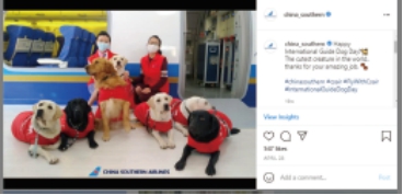 2021年4月的“世(shi)界導(dao)(dao)盲(mang)犬日”,南航發(fa)布(bu)了(le)空(kong)乘與導(dao)(dao)盲(mang)犬的合影。畫(hua)面中,導(dao)(dao)盲(mang)犬和空(kong)乘相處和諧,狀態溫(wen)(wen)馨美好,配合“感(gan)謝導(dao)(dao)盲(mang)犬”等溫(wen)(wen)暖簡短的語言(yan),向(xiang)世(shi)界傳達出南航關愛殘(can)疾人群(qun)體、尊重認可動(dong)物生命價值的情(qing)懷。這一價值觀與海外民眾(zhong)情(qing)感(gan)高度契(qi)合,收獲了(le)諸多正面反饋(kui)。