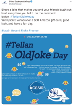 每年(nian)7月,北(bei)美地區(qu)有一個(ge)充(chong)滿趣味的“老笑話日”。當日,人們會通(tong)過講(jiang)笑話的方式釋(shi)放(fang)情緒。南航(hang)通(tong)過邀請(qing)粉絲分(fen)享生活中有趣的小(xiao)笑話、小(xiao)故(gu)事,與(yu)粉絲積極互(hu)動,收獲了超1600條互(hu)動和近10萬曝光(guang)量(liang),文化的融(rong)合在(zai)輕松詼諧的氛圍中得(de)到有效推進。