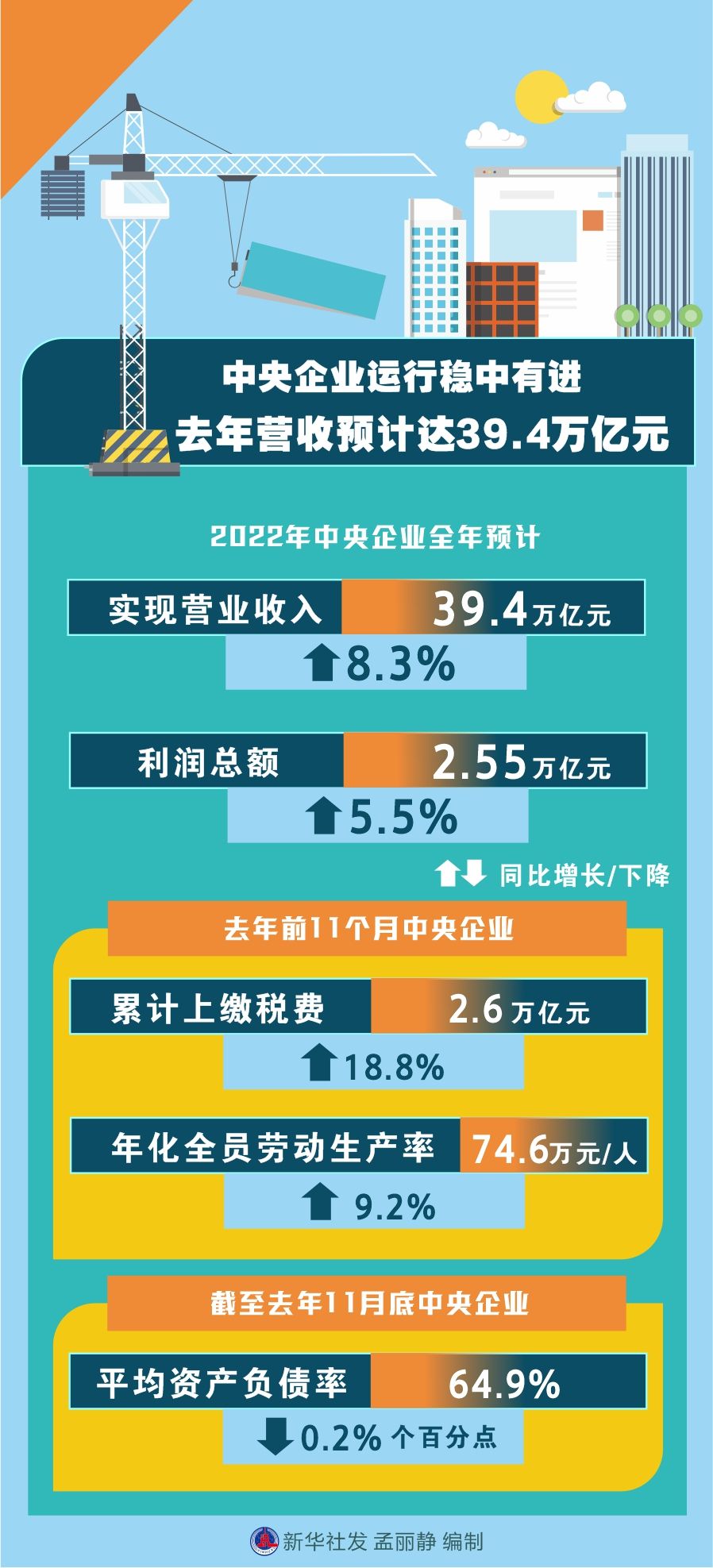 據了解(jie),去年(nian)前11個(ge)月(yue),中央企業累計上(shang)繳稅費2.6萬億(yi)元,同(tong)比增(zeng)長18.8%;年(nian)化全員(yuan)勞動生產率為74.6萬元/人,同(tong)比增(zeng)長9.2%;截至11月(yue)底(di),中央企業平均(jun)資產負債(zhai)率為64.9%,同(tong)比下降0.2個(ge)百分點。
