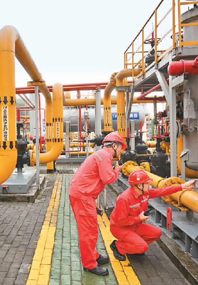 在位于重慶涪陵的中國首個投入商業開發頁巖氣田——涪陵頁巖氣田白濤集輸站,技術人員對設備進行巡檢。