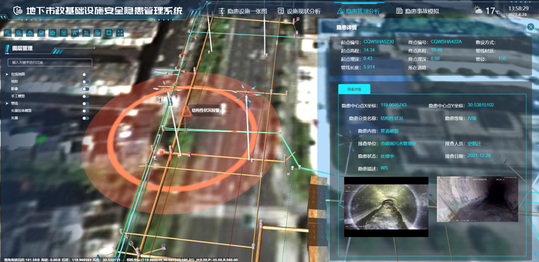地下市政基礎設施綜合管理信息平臺充分利用三維GIS、BIM、IoT、大數據、云計算等信息技術,匯聚地下市政基礎設施數據、基礎地理信息數據、三維模型數據、BIM模型數據等各類城市基礎地下空間信息資源,接入管網壓力、流量,井蓋啟閉狀態等地下市政基礎設施物聯網動態監測數據,實現對城市級、大范圍、多源異構的地下市政基礎設施數字孿生信息集成管理、安全風險預測預警與輔助決策分析,有效減少管網泄漏、洪澇災害、井蓋缺失等引起的安全事故,保障城市地下市政基礎設施安全、經濟、節能的應用和運行,提升城市地下市政基礎設施科學化、精細化、智能化管理水平。當前,平臺已在北京、山東、浙江等地得到了較好的推廣與應用,整體技術成果已逐步成熟。