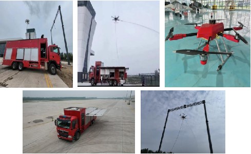 針對高層滅火救援這類世界難題,智研院自主研發空地協同系留無人機消防救援成套裝備,利用大載荷系留無人機掛載輕質水帶和噴射系統,建立滅火劑空中輸送通道,利用超高揚程滅火系統將水基滅火劑由地面持續向空中輸送和向著火點噴射,利用系留無人機作為載體,發揮其載荷大、續航時間長、抗風能力強、可為負載供電等特點,選配紅外線監測儀、高清攝像頭等設備,實現滅火救援工作,突破了高可靠性多余度系統設計、1500V超高壓直流電源等多項關鍵技術,具備斷漿保護、儲備電源、失電保護和應急開傘等多項可靠性措施,將消防車車頂展開,達到快速起飛,飛行高度不低于150米,凈載重不低于120kg,抗風等級不低于6級,有效滅火距離不低于20m,滅火劑流量不低于100L/min,持續工作時間不低于6小時連續長時間的高空懸停和不間斷滅火作業。