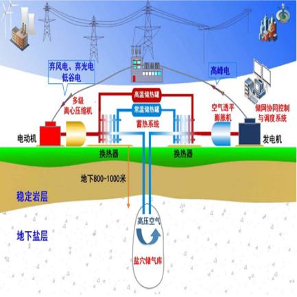 基于鹽穴的非補燃壓縮空氣儲能技術屬于能量型儲能技術,是構建新型電力系統、支撐能源結構轉型升級、實現“碳達峰、碳中和”的關鍵技術,可在電網中提供調節服務,主要包括調峰、調頻、調相、備用、黑啟動等,可緩解輸配電阻塞及延緩輸配電設備投資、提高供電可靠性。此外,與電池等其他儲能技術相比,非補燃壓縮空氣儲能系統具有獨特的多能聯儲、多能聯供功能,通過吸收電網多余電力,可實現發電、供熱、制冷三聯產。同時該技術不依賴化石燃料,具有大容量、高效率、長壽命、零排放、技術成熟等優點。電站由電動機、壓縮機組、鹽穴儲氣庫、蓄熱系統、膨脹機組、發電機、調度控制系統和送出系統組成,核心設備全部國產化,具有完全自主知識產權。