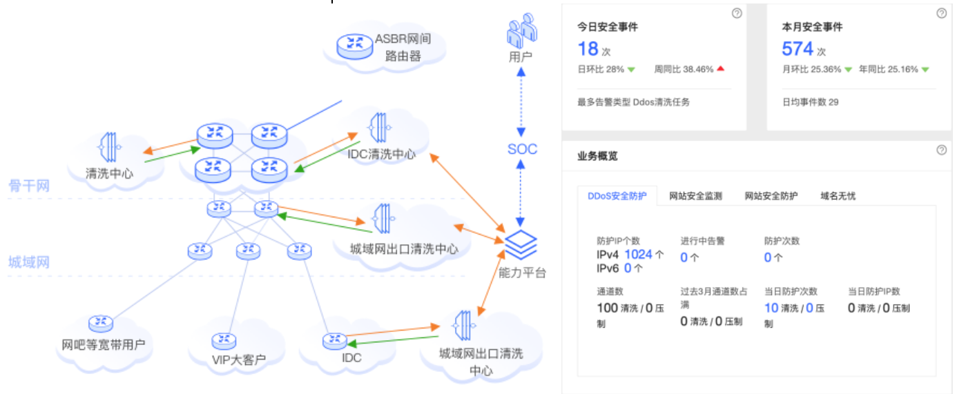 分布式近源DDoS攻擊防護系統,是由中國電信基于運營商網絡帶寬和流量調度能力自主研發的,具備快速準確DDoS攻擊虛假源追溯、基于IP關系挖掘識別僵尸網絡控制端、靈活應對超大體量互聯網攻擊的安全防御系統。系統開拓性創新了攻擊實時監控、近源清洗獨享T級帶寬、近源壓制秒級生效、分析溯源等關鍵技術,整體上達到國際先進水平,曾獲得中國通信學會科技進步一等獎。系統已服務于金融、教育、能源等萬余家政企客戶,年平均防御網絡攻擊33萬次,在每年重大活動和國際重要會議保障中更是承擔了重要保障責任,成功抵御數次攻擊,得到了客戶和國家相關管理部門的高度贊譽。