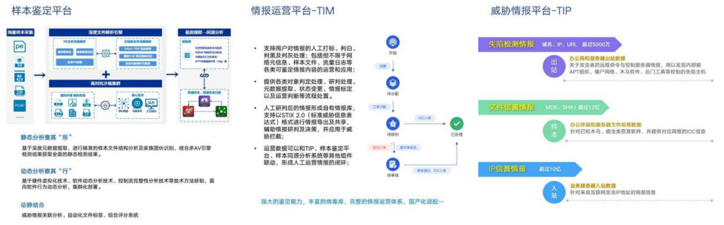 基于高對抗文件樣本分析、RAS樣本分析檢測引擎、APT家族關聯分析、惡意代碼同源性分析、內生情報數據驅動的情報生產運營及消費等技術,提供威脅研判、攻擊定性、黑客畫像以及威脅持續跟蹤等多維度的威脅情報數據和分析應用服務,實現更加高效便捷的情報處理和運營能力,及時響應突發威脅及高級威脅,快速分析威脅事件、遏制重大風險,為各類客戶提供一體化情報自生產服務。