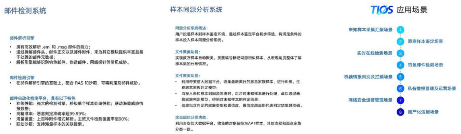 奇安信威脅情報運營系統TIOS是由奇安信威脅情報中心資深安全分析師打造的本地化一站式威脅情報分析運營系統。該系統包含:樣本鑒定平臺、情報運營平臺-TIM、威脅情報平臺-TIP、郵件檢測系統、樣本同源分析系統等安全組件,實現威脅情報數據導入、生產、處理、運營與消費的閉環建設。