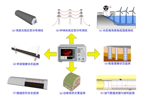 光纖應變分布測試儀以光纖作為傳感器,能夠同時測試光纖光纜的應變分布、損耗分布及各距離點的布離淵散射譜,具備3D及多種分布參數同時顯示功能以及應變測試精度高、重復性好、單端無損測試等優點,整機內置VFL(可視故障定位)功能,可快速對光纖線路故障進行定位,產品廣泛應用于隧道、橋梁、大壩、油氣管道等大型建筑和飛機艦船、航空航天器等大型裝備的健康狀態監測和安全防護,以及山體滑坡、泥石流、地面沉降等自然災害的預警預報。產品也可應用于光纖陀螺、光纖水聽器的研制與生產過程檢測以及海底光纜的研制、生產、施工、驗收及鏈路維護過程中對光纖環及海底光纜的應變分布測試。目前產品已具備批量生產能力,可實時供貨。
