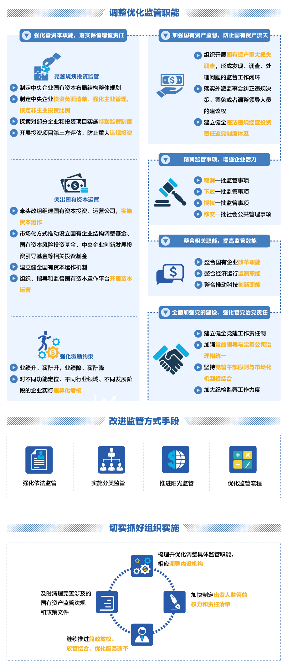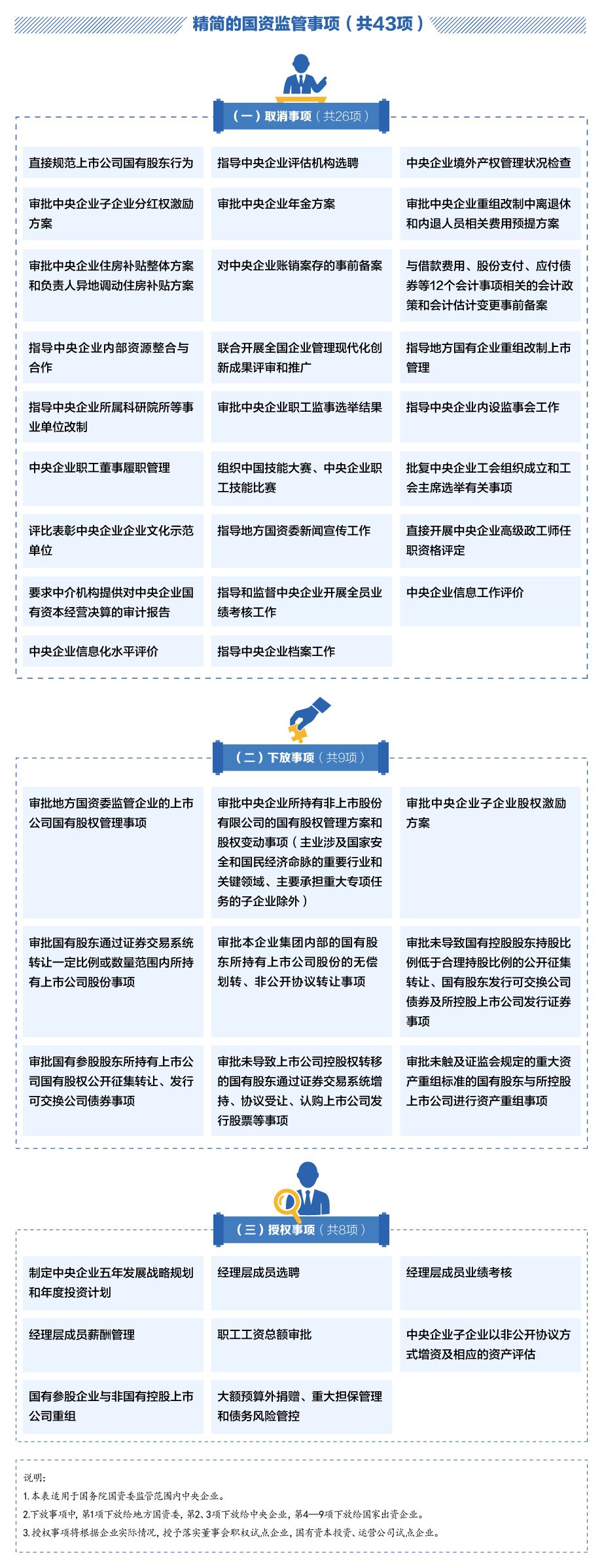 黨的十八大以來,國務院國資委認真貫徹落實黨中央、國務院關于深化國有企業改革的決策部署,準確把握國有資產監管機構的出資人代表職責定位,堅定不移深化國有企業改革,探索完善國有資產監管體制機制,積極推進國有企業結構調整、創新發展,為實現國有資產保值增值、防止國有資產流失、發展壯大國有經濟作出了積極貢獻。但與此同時,國有資產監督機制尚不健全,國有資產監管中越位、缺位、錯位問題依然存在,亟需加快調整優化監管職能和方式,推進國有資產監管機構職能轉變,進一步提高國有資本運營和配置效率。4月27日,國務院辦公廳轉發《國務院國資委以管資本為主推進職能轉變方案》,明確提出調整優化國資監管職能,改進監管方式手段,著力提高國有資本效率,增強國有企業活力。文件還明確了精簡的國資監管事項共43項。 |