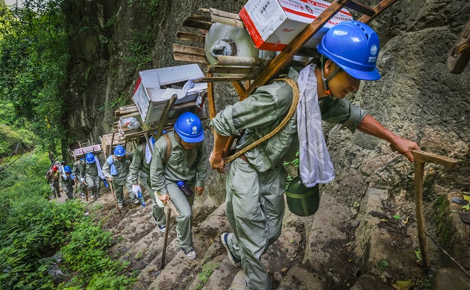 湖北省長陽縣,土家電工用背架運送(song)村村通動力電材料