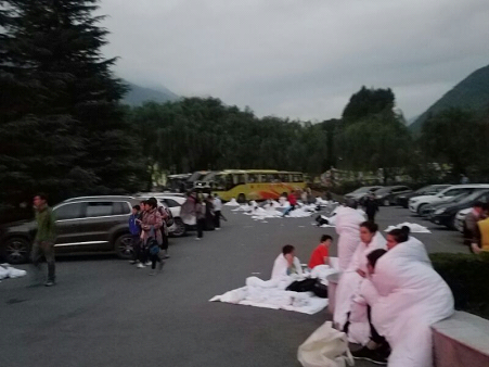 由(you)于(yu)地震后余震不斷,人心恐(kong)慌,加(jia)之晚間氣溫(wen)低,部分(fen)游客(ke)情緒激動,為(wei)防止出現(xian)不安(an)全(quan)事故,賓(bin)館所有員(yuan)工分(fen)成(cheng)4個組對賓(bin)客(ke)進(jin)行(xing)安(an)撫工作,為(wei)賓(bin)客(ke)及時提供保暖物(wu)資,飲用水(shui)和食物(wu)。