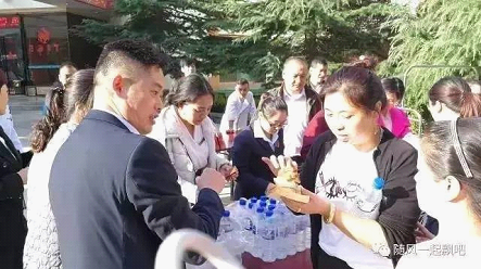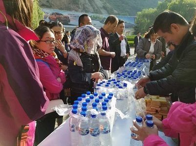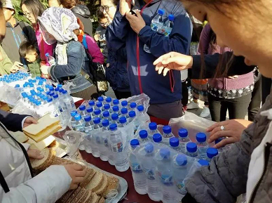 工作人員分發飲用水(賓館客人拍攝)