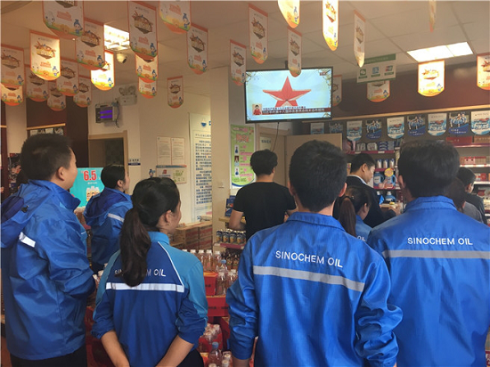 中化江西石油公司所屬加油站的員工和顧客一起觀看十九大開幕式