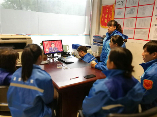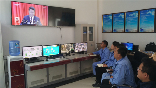 中化節能環保公司員工在項目中控室利用工作間隙收看十九大開幕式直播