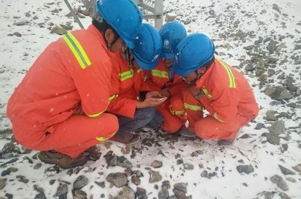 青海送變電工程公司員工在玉樹聯網工程330千伏唐瑪線保電現場通過手機收看直播。