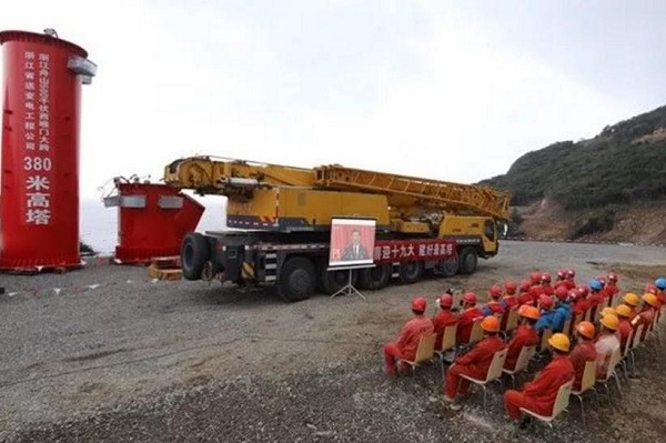 在浙江舟山500千伏聯網輸變電工程380米世界最高輸電鐵塔施工現場,工程臨時黨支部全體黨員集中收看直播。