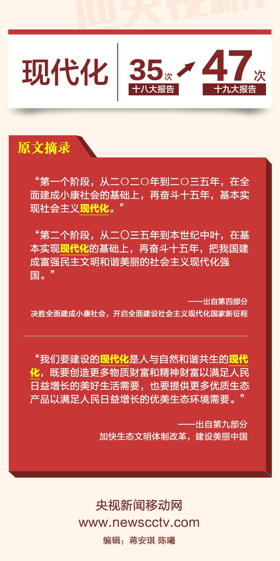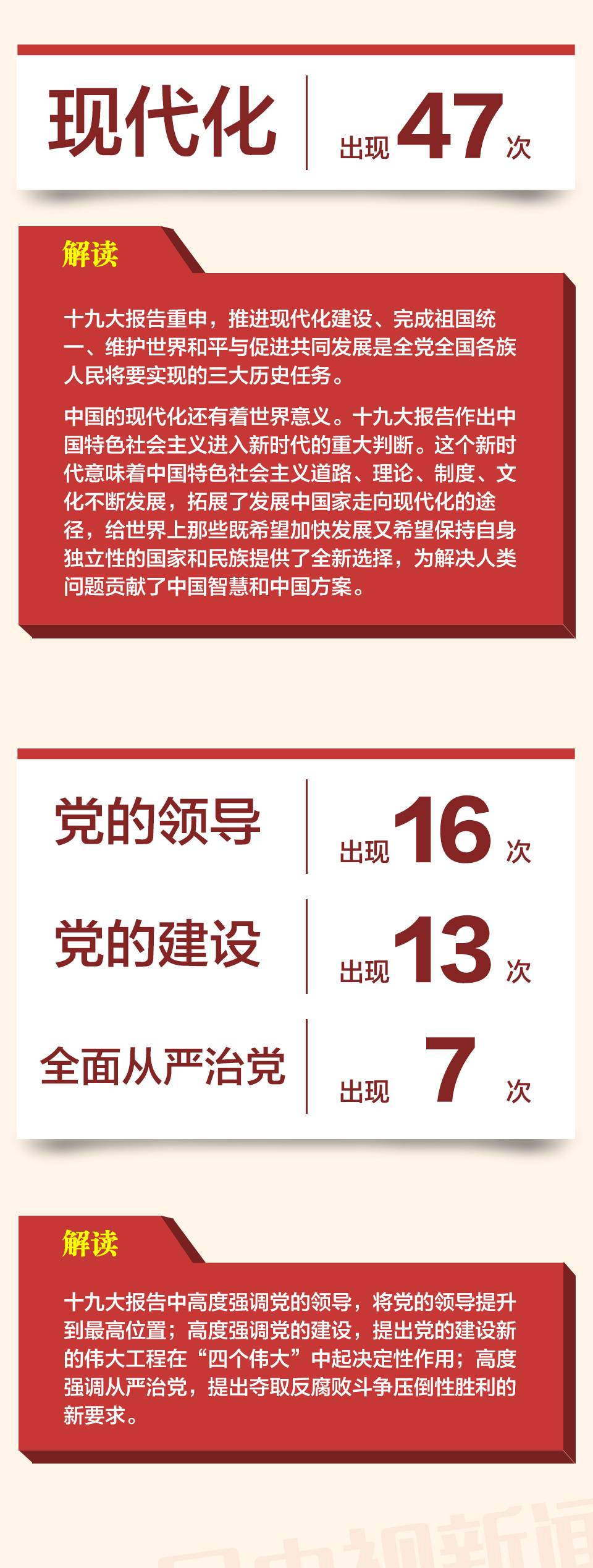 十九大報告(gao)中(zhong),許(xu)多重要關鍵(jian)詞(ci)(ci)被反復提及。“新時代”一詞(ci)(ci)首(shou)次出(chu)現在報告(gao)中(zhong),出(chu)現頻率也達到(dao)了(le)30余次。此外(wai),“中(zhong)國(guo)特色社會主(zhu)義”、“現代化(hua)”、“黨的領導”等詞(ci)(ci)也在報告(gao)中(zhong)占據了(le)重要的位置。