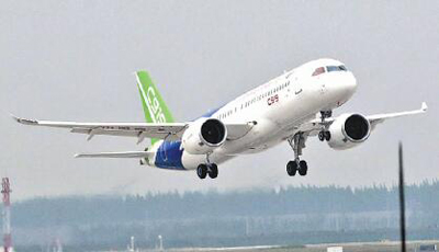 強起來的新時代既有國家硬實力的顯著增長,也有日益走近世界舞臺中央話語“軟實力”的強勁提升。圖為國產大飛機C919雄姿。(光明圖片/視覺中國)