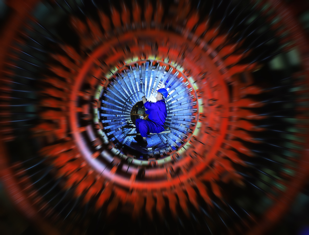 作品說明:一名技師正在對60W機組的(de)發電機定子線圈(quan)進行認真檢查(cha)。