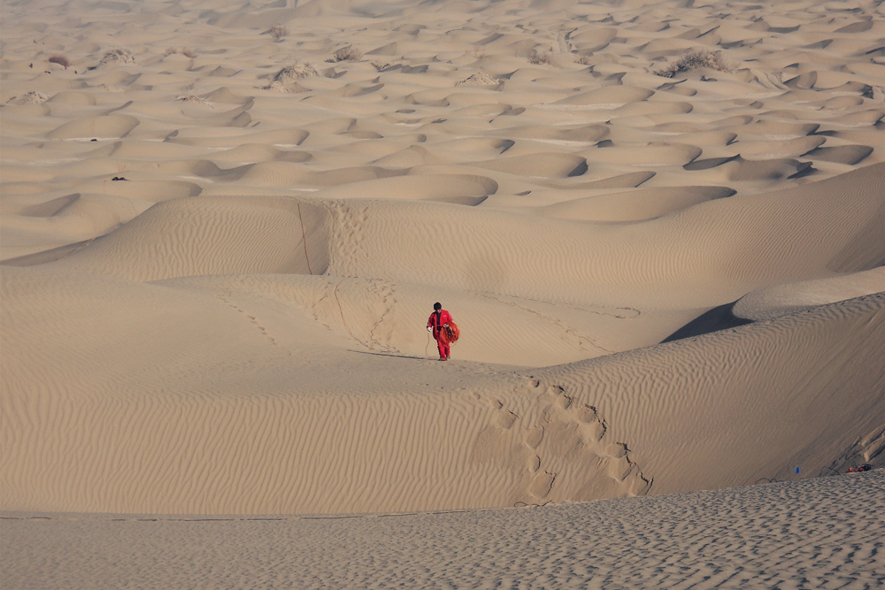 作品說明:中(zhong)石化勘(kan)探人(ren)員在塔克拉瑪干沙(sha)漠進行(xing)(xing)地震勘(kan)探,圖為放線人(ren)員進行(xing)(xing)施工作業。