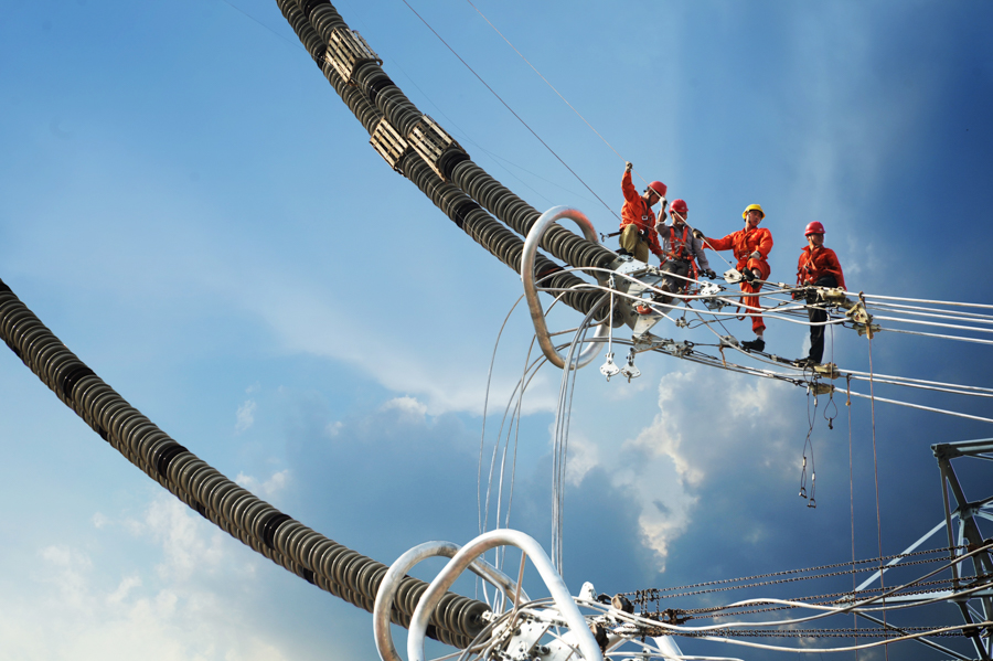 作品說明:2014年5月27日,在(zai)浙(zhe)江金(jin)華1000千(qian)伏特高壓線路(lu)上,電力工人(ren)們正在(zai)高空施工。