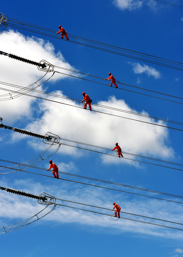 作品說明:照片(pian)是2016年拍(pai)攝于所轄變電(dian)站線路切改的場景,架線工人(ren)好(hao)比電(dian)網(wang)蜘蛛俠,又好(hao)比音樂(le)(le)大師,在藍天上譜寫(xie)輝煌的樂(le)(le)曲(qu)。