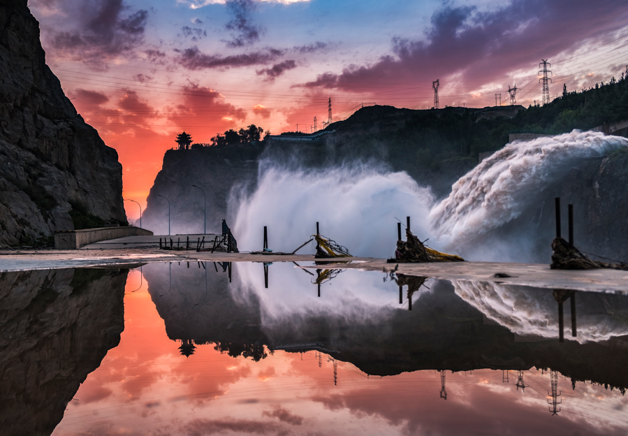 作品說明:黃河(he)水位持續上漲,劉家峽開(kai)閘泄(xie)洪,晚霞(xia)襯托下的美景。