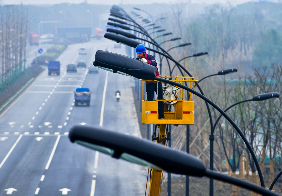 作品說明:2013年2月5日,國(guo)網海(hai)寧市供電公司的工人正在新通車(che)的浙江海(hai)寧林蔭大道上(shang)安裝新路燈(deng)。