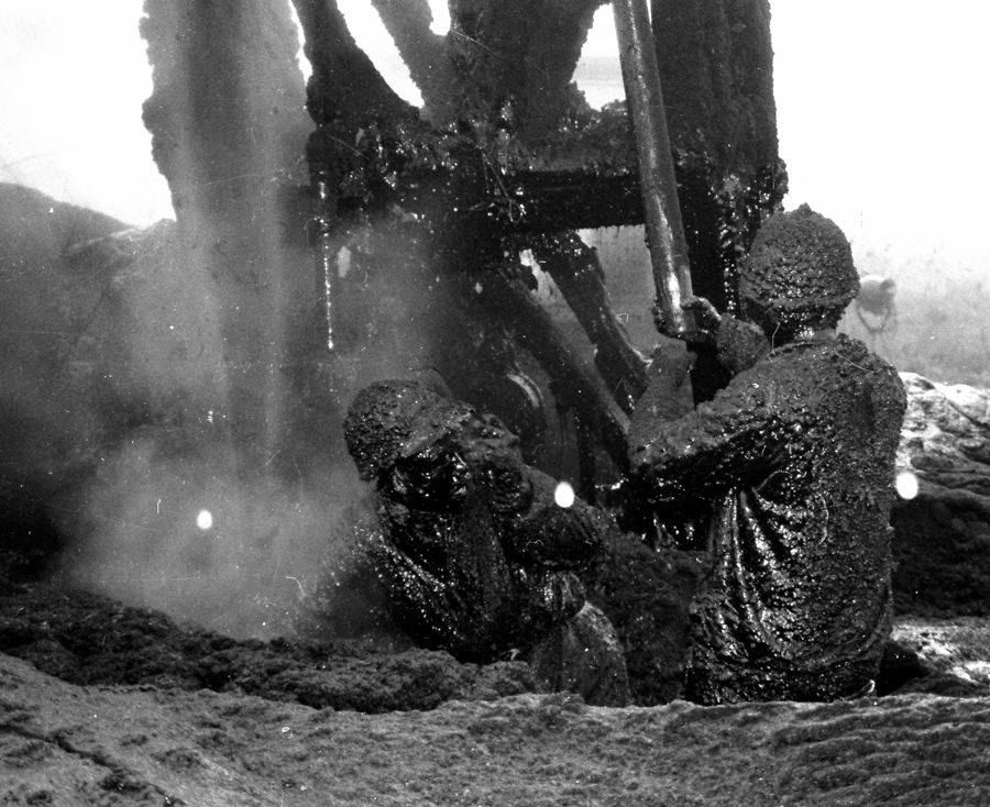 作品說明:1961年(nian)4月(yue)16日,山東省廣饒縣東營村附近(jin)打出了(le)(le)(le)第一口(kou)工業油流井(jing)—華8井(jing)。為了(le)(le)(le)保證(zheng)正常(chang)生產,幾個(ge)同志一擁而上(shang)用手(shou)扒起(qi)來,一個(ge)個(ge)凍得直(zhi)打哆嗦(suo),仍然(ran)咬牙堅持干,保證(zheng)了(le)(le)(le)正常(chang)快速鉆進。