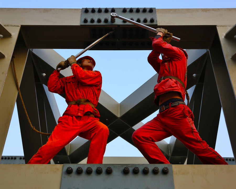 作品說明:2015年1月(yue)18日(ri),在港珠澳大(da)橋鋼(gang)箱梁(liang)(liang)建設工(gong)地,中鐵山橋集團(tuan)員(yuan)工(gong)正在擰緊鋼(gang)箱梁(liang)(liang)連接板螺栓。