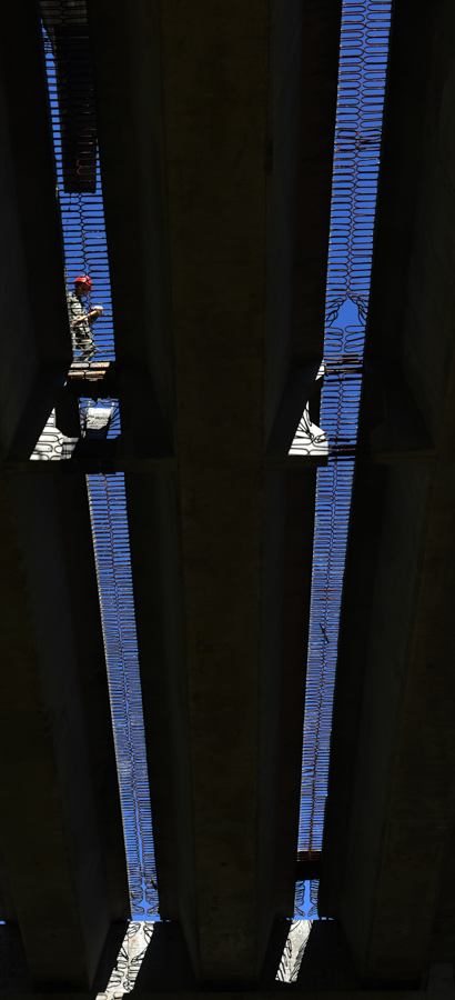 作品說明:青(qing)海省民和(he)(he)至平安(小(xiao)峽(xia))段公(gong)路(lu)工程,簡稱(cheng)民小(xiao)公(gong)路(lu),其中(zhong)物(wu)流園(yuan)(yuan)區特(te)大橋長1507.6m,上跨(kua)京藏(zang)高速公(gong)路(lu)和(he)(he)湟水(shui)河(he),為全線最長的(de)(de)(de)(de)橋。2016年9月6日,已架設完畢的(de)(de)(de)(de)物(wu)流園(yuan)(yuan)區特(te)大橋正在進行橋面系施工。從橋下望(wang)去(qu),大橋兩(liang)片(pian)(pian)梁體之間(jian)的(de)(de)(de)(de)間(jian)隙中(zhong),一(yi)個(ge)(ge)工人正在忙碌,他(ta)的(de)(de)(de)(de)頭頂是(shi)一(yi)片(pian)(pian)蔚(yu)藍(lan)的(de)(de)(de)(de)天空,他(ta)的(de)(de)(de)(de)身影就(jiu)像巨大鋼(gang)琴上的(de)(de)(de)(de)一(yi)個(ge)(ge)小(xiao)小(xiao)琴鍵(jian),又像是(shi)優美樂譜中(zhong)的(de)(de)(de)(de)一(yi)個(ge)(ge)小(xiao)小(xiao)音(yin)符。這是(shi)一(yi)個(ge)(ge)普通建設者(zhe)的(de)(de)(de)(de)縮影,正是(shi)他(ta)們的(de)(de)(de)(de)辛勤(qin)付(fu)出,筑就(jiu)了(le)一(yi)條條大路(lu)和(he)(he)一(yi)幢幢高樓。