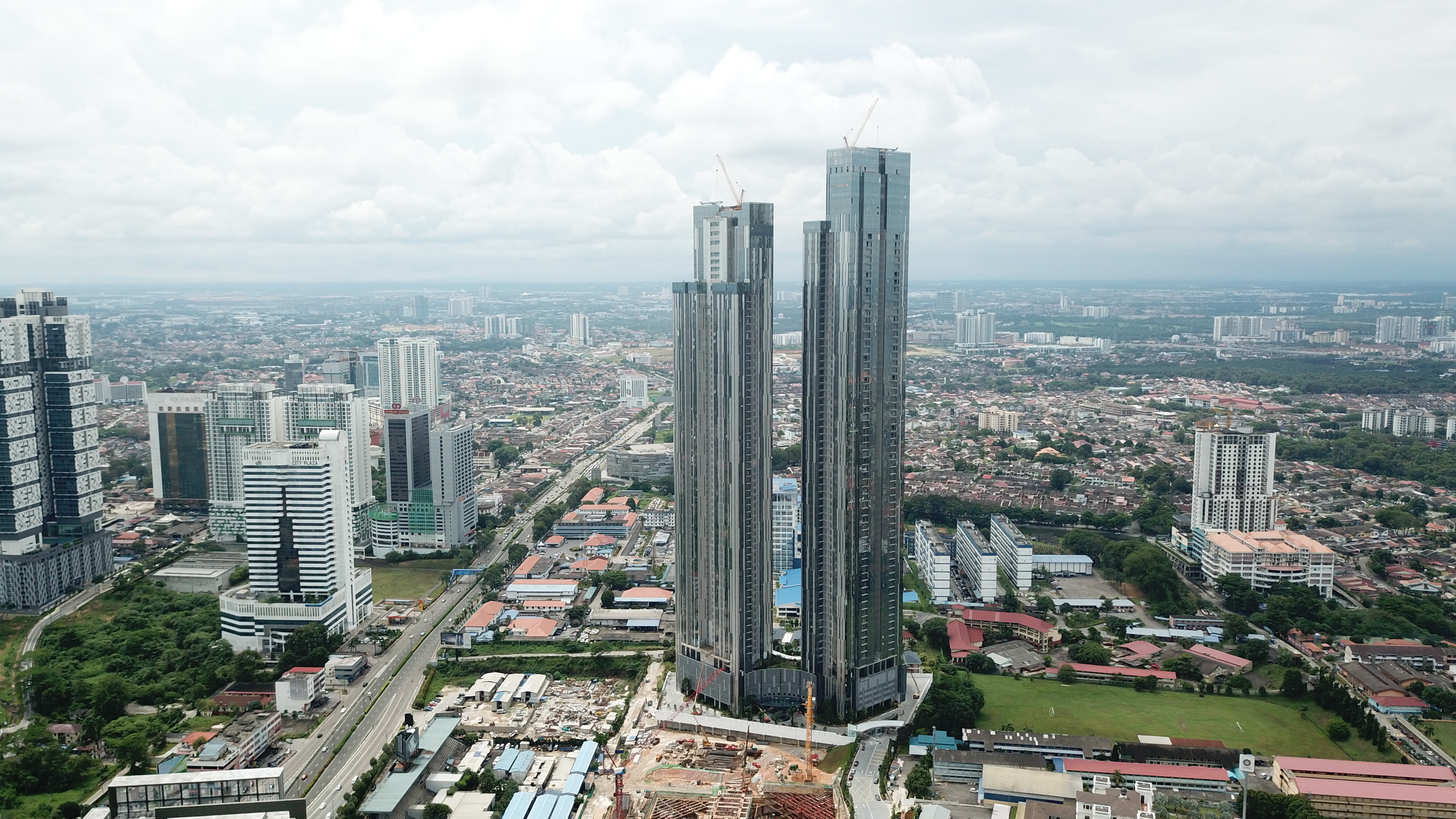 鏡頭一轉,離(li)海岸(an)不(bu)遠(yuan)的(de)地方(fang),有(you)兩棟筆直的(de)大樓(lou)直聳(song)天際,剛下過雨的(de)新山,還有(you)少許(xu)霧氣,塔尖在霧氣中忽隱忽現,隨(sui)著無人(ren)機漸(jian)(jian)漸(jian)(jian)飛近、略過塔尖,頂層的(de)塔吊和忙碌的(de)工人(ren)清晰可見(jian),小伙伴們的(de)嘴巴漸(jian)(jian)漸(jian)(jian)張大,不(bu)禁發出(chu)了“哇!”的(de)感嘆聲。