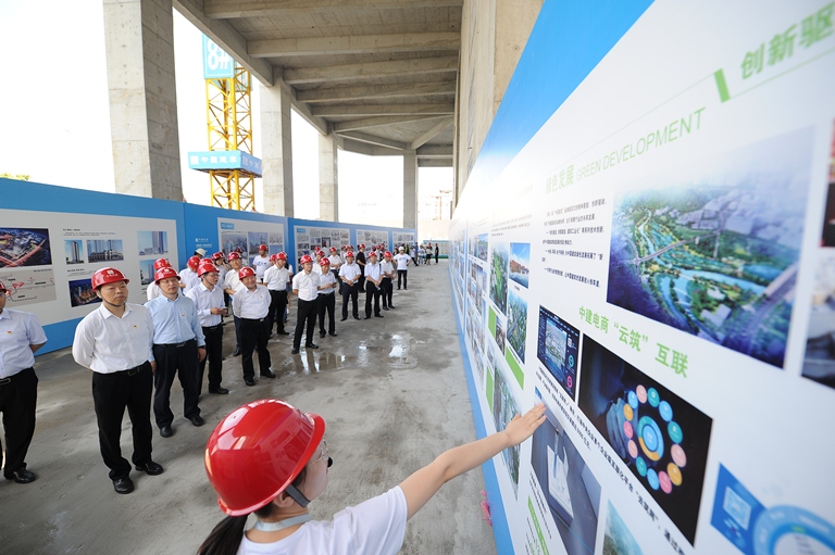 在(zai)中建六局中建中心項目活動現場,與會(hui)人員(yuan)參觀(guan)中國建筑品牌展