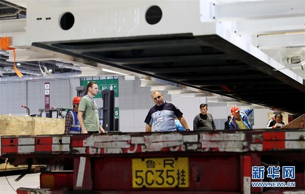 工人們在國家會展中心(上海)7號館內將從集裝箱中拆出的“金牛座”龍門銑床的零部件進行組裝