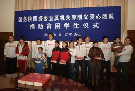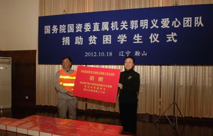 “國(guo)資委直屬機關(guan)郭明義愛心(xin)(xin)團隊(dui)”一行于10月17日晚10:53乘火車開(kai)始了(le)為期(qi)(qi)(qi)三天的學(xue)習(xi)考察。活動期(qi)(qi)(qi)間(jian),愛心(xin)(xin)團隊(dui)與“當代雷鋒”郭明義同志進行了(le)座談交(jiao)流,向郭明義同志贈送了(le)“學(xue)習(xi)郭明義,傳(chuan)承雷鋒精神”牌匾(bian),向郭明義愛心(xin)(xin)團隊(dui)長(chang)期(qi)(qi)(qi)資助(zhu)的20名貧困(kun)學(xue)生捐贈了(le)國(guo)資委直屬機關(guan)廣大干部職工在(zai)今(jin)年五四期(qi)(qi)(qi)間(jian)募(mu)捐的愛心(xin)(xin)善(shan)款46226.50元、筆記本電腦以(yi)及《現代漢(han)語(yu)詞典》等物品(pin)。