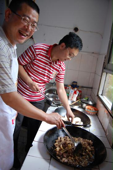 作者于2012年參加“根在基層 走進一線”中央國家機關青年干部調研實踐活動,來到四川省宜賓縣工商局。臨行前,作者和宜賓縣工商局徐劍平局長共同下廚,為參加活動的中央國家機關青年和當地工商所的同志們做了一頓飯。作者做的是北方特色的肉夾饃,徐局長做的是有當地特色的菜籽油燒鴨。