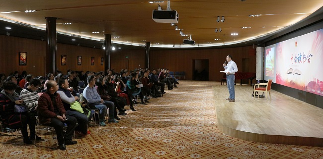 讀書會邀請了全國優秀縣委書記、原湖北省恩施州巴東縣委書記陳行甲進行專題講座,陳行甲結合黨的十九大精神,以“如何與人民群眾保持血肉聯系”為題,分享了任職巴東縣委書記的經歷和感受、與人民群眾保持血肉聯系的實踐和思考、以及辭去公職投身公益事業的抉擇和追求。陳行甲同志談到,黨的十九大報告有203次提到了“人民”一詞,充分體現了中國共產黨“全心全意為人民服務”的根本宗旨和“立黨為公,執政為民”的崇高情懷。