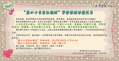 2015年3月5日(ri),值學雷鋒(feng)紀(ji)念日(ri)之際,石化聯合(he)(he)會所屬化學工(gong)業(ye)出版社團委(wei)聯合(he)(he)“郭明義愛心(xin)團隊”青年志愿隊發起“愛心(xin)小書包認領站(zhan)”活動。
